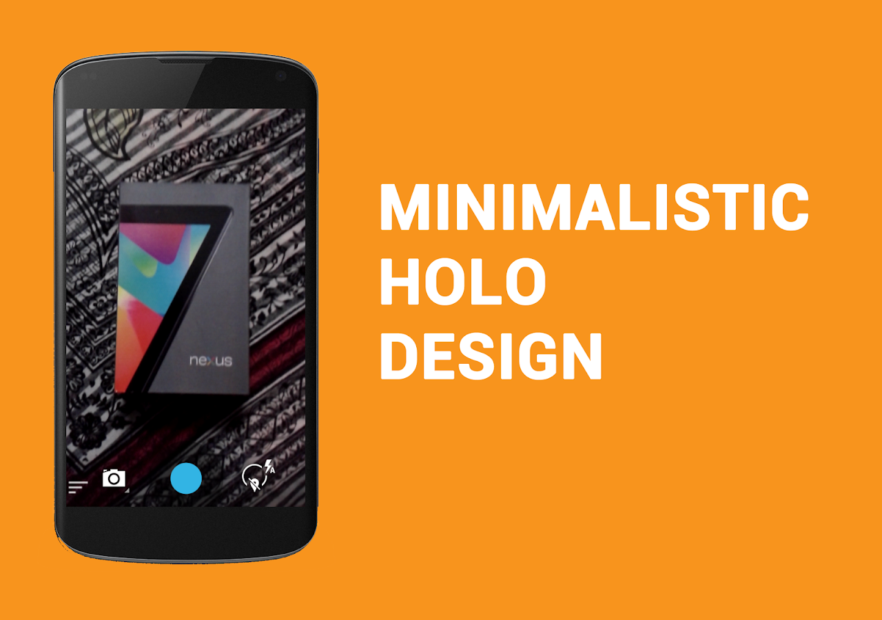 Features slick UI.Holo Camera+ is a source compiled, minimalistic version of the AOSP Android 4.4 KITKAT Camera.